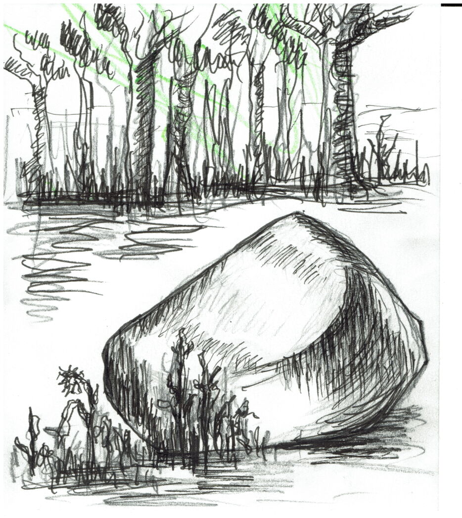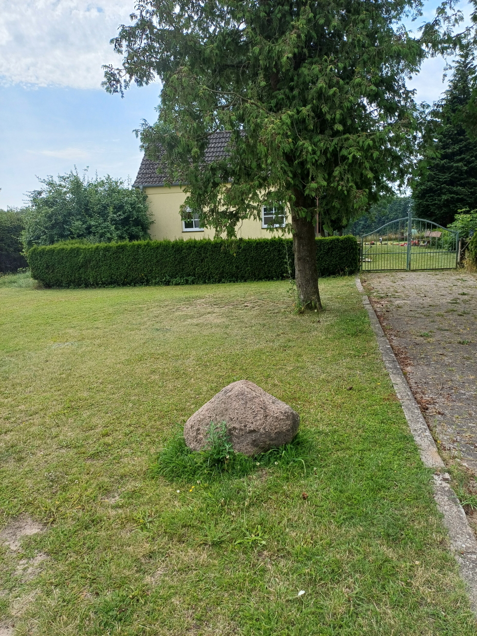 Der Feldstein, der neben dieser Tafel liegt stammt mit großer Wahrscheinlichkeit von der Kirchruine Ollendorf. Der Stein lag auf dem Grundstück der Familie Witt, auf dem die Kirche gestanden haben soll. Familie Witt hat den Stein freundlicher Weise der Gemeinde zur Verfügung gestellt